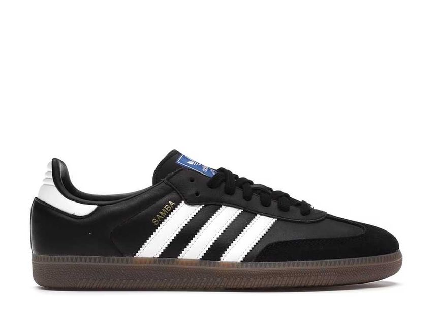 The adidas Samba Black-White Gum shoe,is a product made from kangaroo leather with an innovative lightweight upper and gum rubber sole for grip. It features adidas stripes on its sides. Of course, as their name suggests, the shoes are black and cloud-white and come with white or black shoelaces made of polyester and plastic. adidas Samba Black-White Gum’s tongue is branded with the adidas logo. Samba branding is just beneath the collar, close to the stripes on the sides of the sneakers.