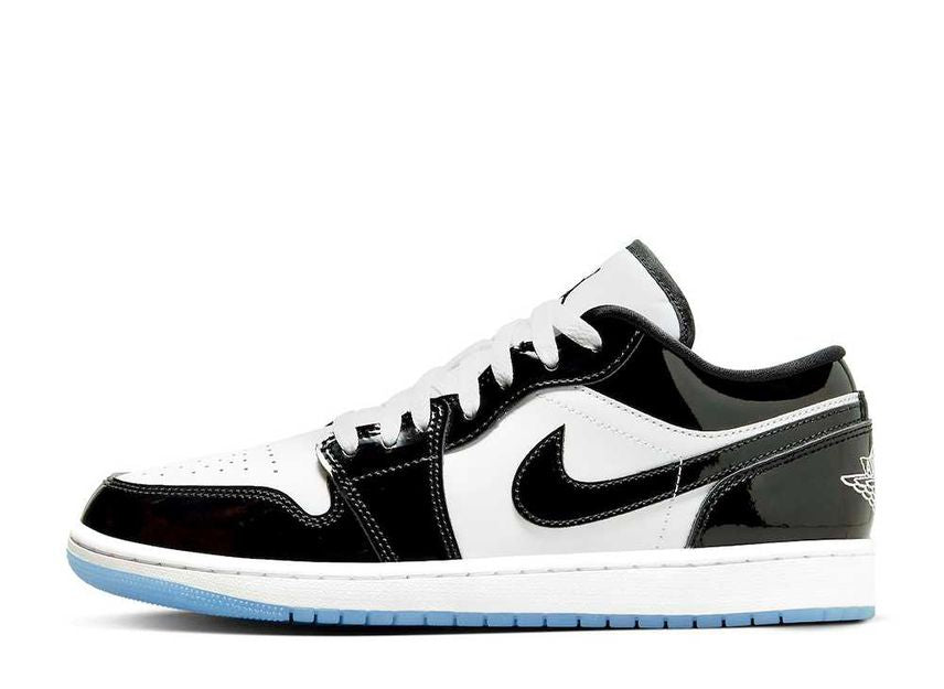 This offering of the low-top Air Jordan 1 features a White leather base with mesh tongues and Black patent leather Swooshes and overlays. Black Jumpman on the tongues, White Wings on the heels AJ11-inspired insoles atop a White midsole and icy translucent outsole completes the design.